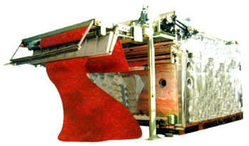 ●在標(biāo)準(zhǔn)型蒸箱中,織物通過間歇回轉(zhuǎn)的不銹鋼掛布輥輸送運行通過全蒸箱,掛布輥兩端均與蒸箱各側(cè)的一循環(huán)鏈相連并連續(xù)回轉(zhuǎn)通過蒸箱,在環(huán)形成后往布輥載織物環(huán),以連續(xù)不斷的狀態(tài)運行通過蒸箱。