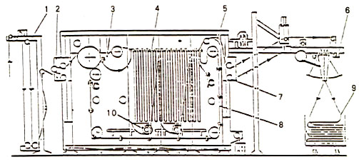6-出布裝置 7-出布封門 8-導(dǎo)輥傳動鏈 9-織物 10-循環(huán)風(fēng)機(jī)