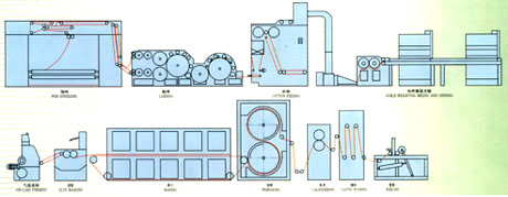 開松機——給棉機——梳理機——鋪網(wǎng)機——氣流雜亂成網(wǎng)機——浸漬機(發(fā)泡)一一烘燥機一一焙烘機一一燙光機一一軋光機一一收卷機